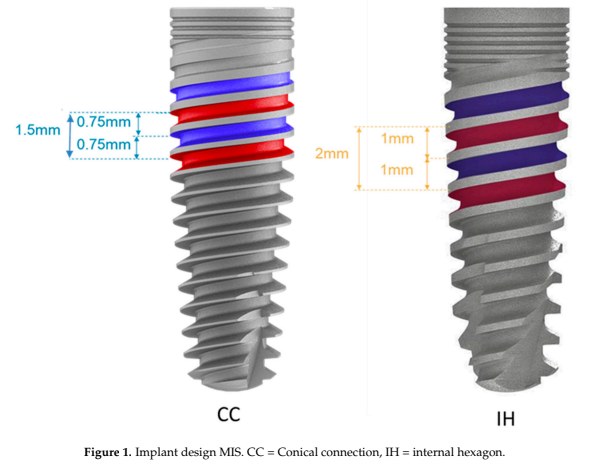 Legenda: Design de implante. CC = Conexão cônica, IH = hexágono interno.